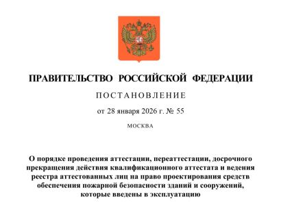 Опубликовано постановление Правительства РФ от 28.01.2026 № 55 «О порядке проведения аттестации, переаттестации, досрочного прекращения действия квалификационного аттестата и ведения реестра аттестованных лиц на право проектирования средств обеспечения пожарной безопасности зданий и сооружений, которые введены в эксплуатацию»