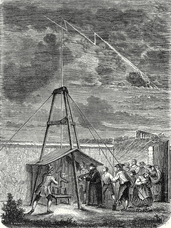 Отцом разработки принципа молниезащиты считают американского политика и изобретателя Бенджамина Франклина. В 1752 г Франклин осуществил простой эксперимент: во время грозы запустил воздушного змея, к которому прикрепил длинную проволоку с металлическим ключом, и зарядил от этого устройства лейденскую банку. Франклин на ряде опытов доказал, что электричество, полученное от грозовых туч, ничем не отличается от электричества, полученного трением. Этот эксперимент вызвали огромный интерес. Загадочная природа молнии была раскрыта. Об этом сразу же сообщили газеты и журналы многих стран мира. Повсеместное признание получила и предложенная им конструкция молниеотвода.
