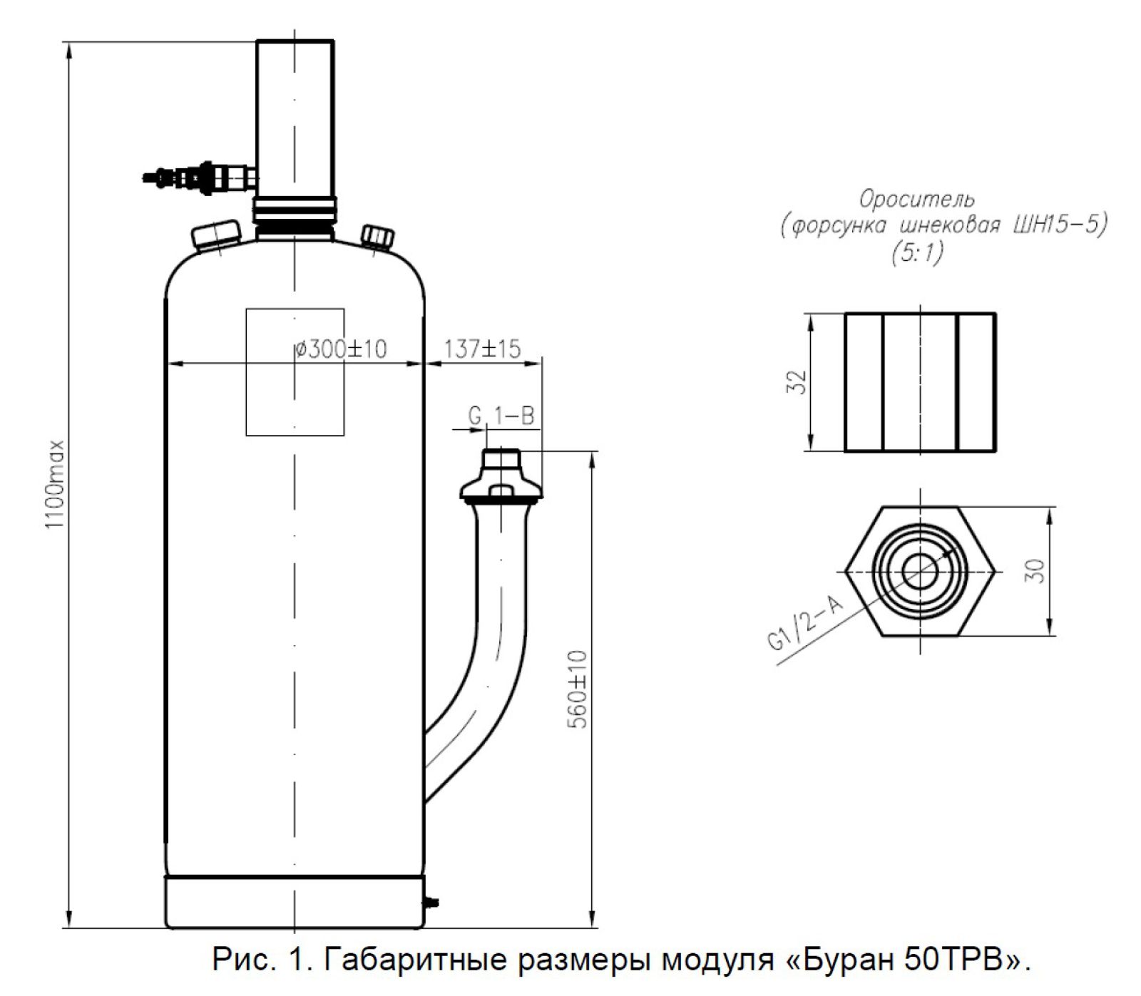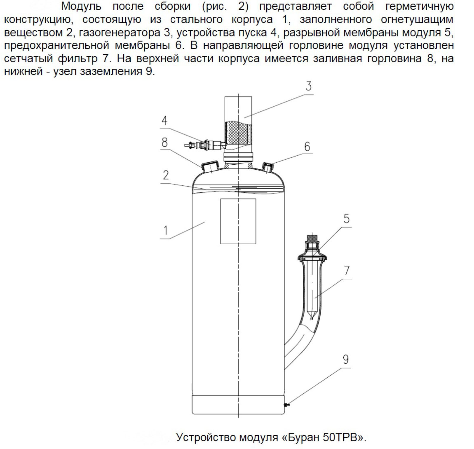 - для тушения пожаров классов А, В, а также пожаров, возникающих в помещениях с кабелями, электроустановками и электрооборудованием, находящимися под напряжением до 1000 В. Обозначение модуля при заказе: МУПТВ-50-ГЗ-ВД «Буран 50ТРВ» чертеж СПТГ.405000.000;
