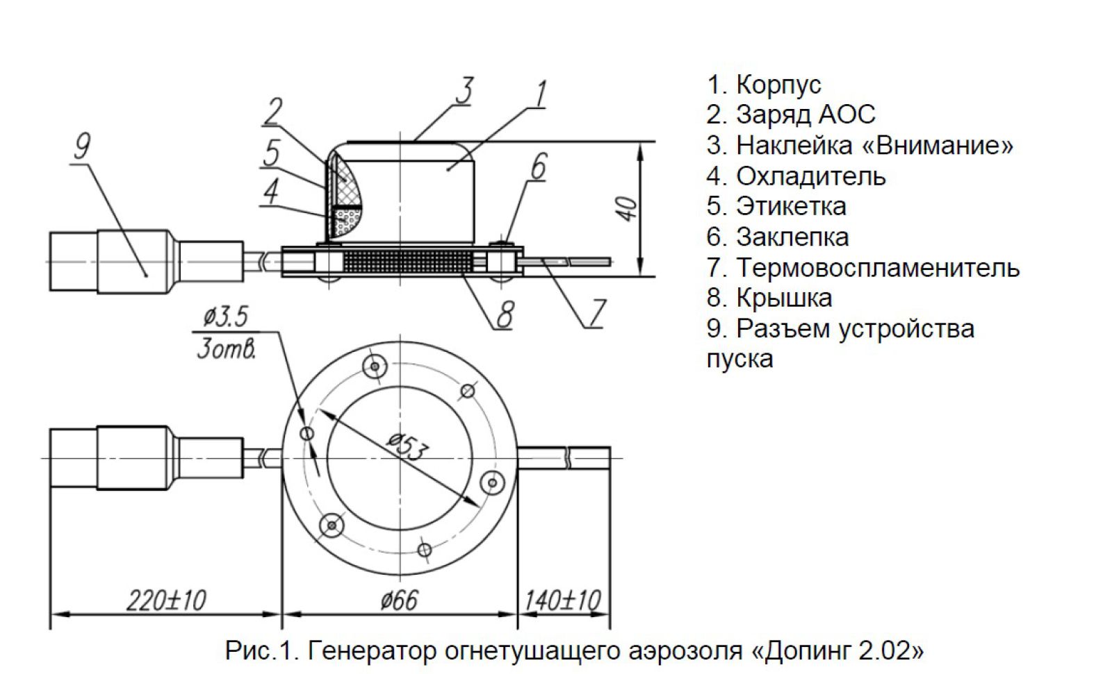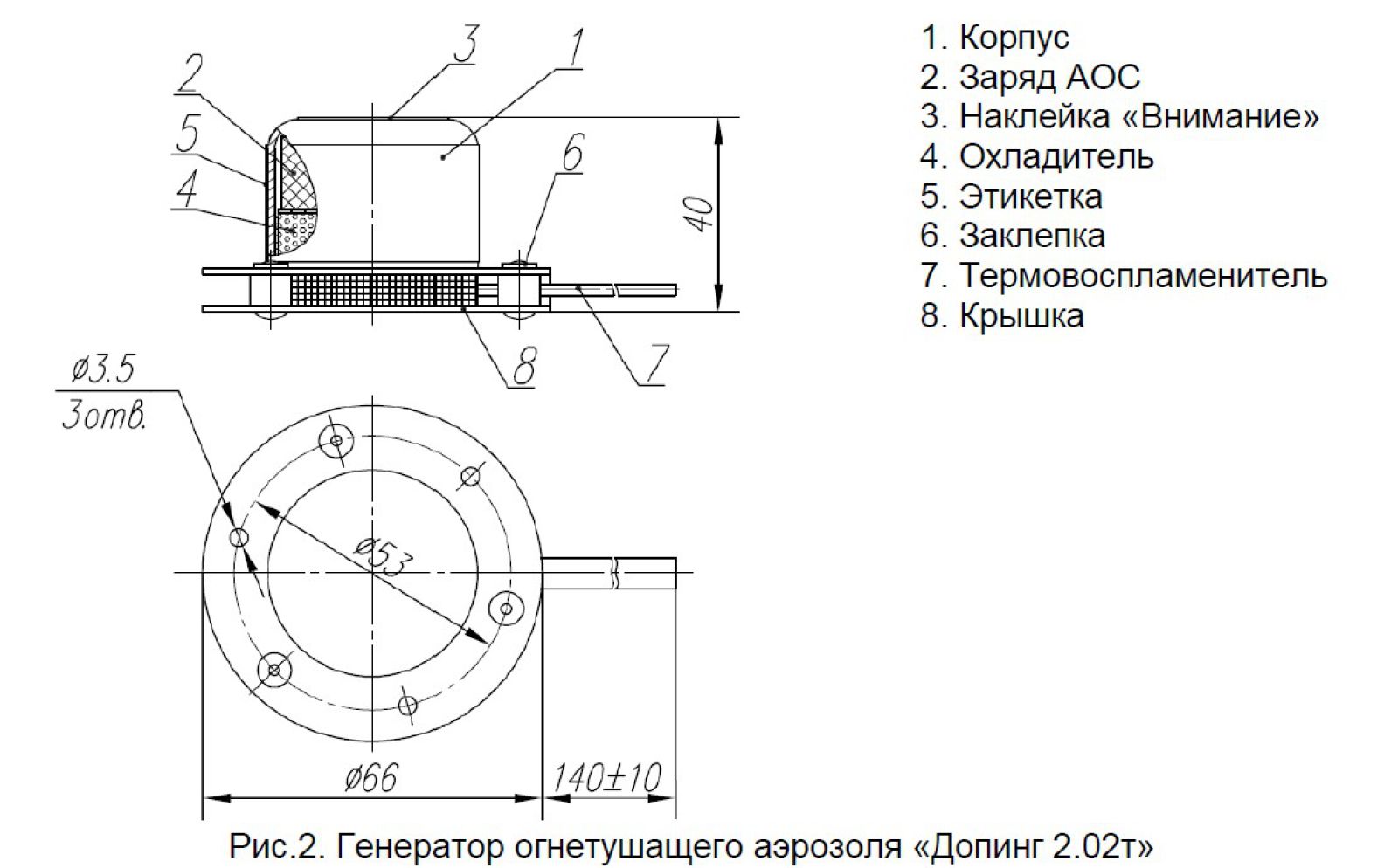 Генератор огнетушащего аэрозоля «Допинг 2.02» / «Допинг 2.02т» (в дальнейшем «генератор») с радиальным истечением аэрозоля предназначен для тушения в условно-герметичных объемах пожаров и загораний по ГОСТ 27331-87 следующих классов: