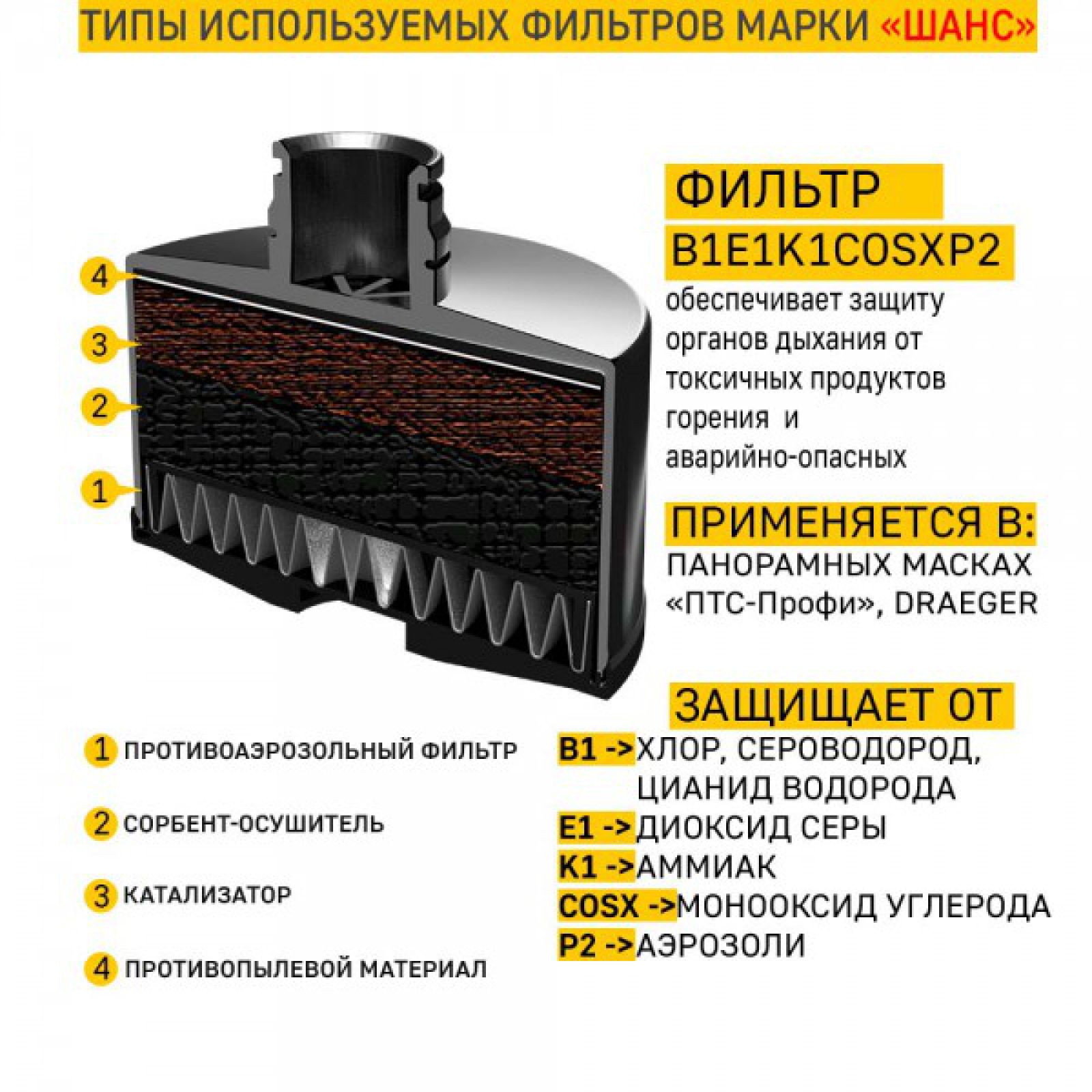 - Предназначен для применения для обеспечения работы при пожаре (ЧС) на открытой местности (при условии не превышения массы фильтра на 15 гр. от указанной на маркировке фильтра).