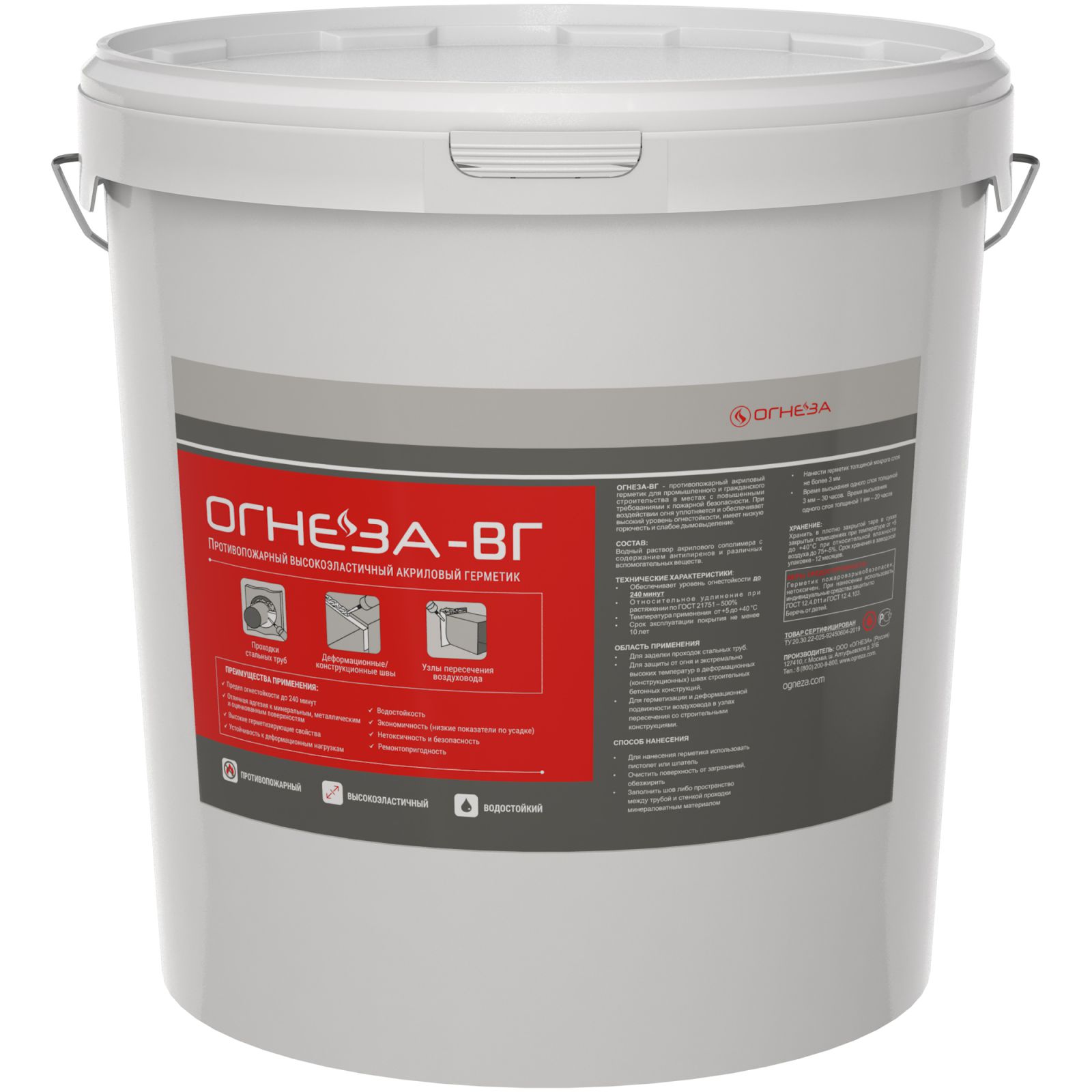 Акриловый противопожарный герметик «ОГНЕЗА-ВГ» упаковывается согласно ГОСТ 9980.3 в ведра 20 кг и 3 кг; туба 310 мл и фолиевая туба 600 мл.