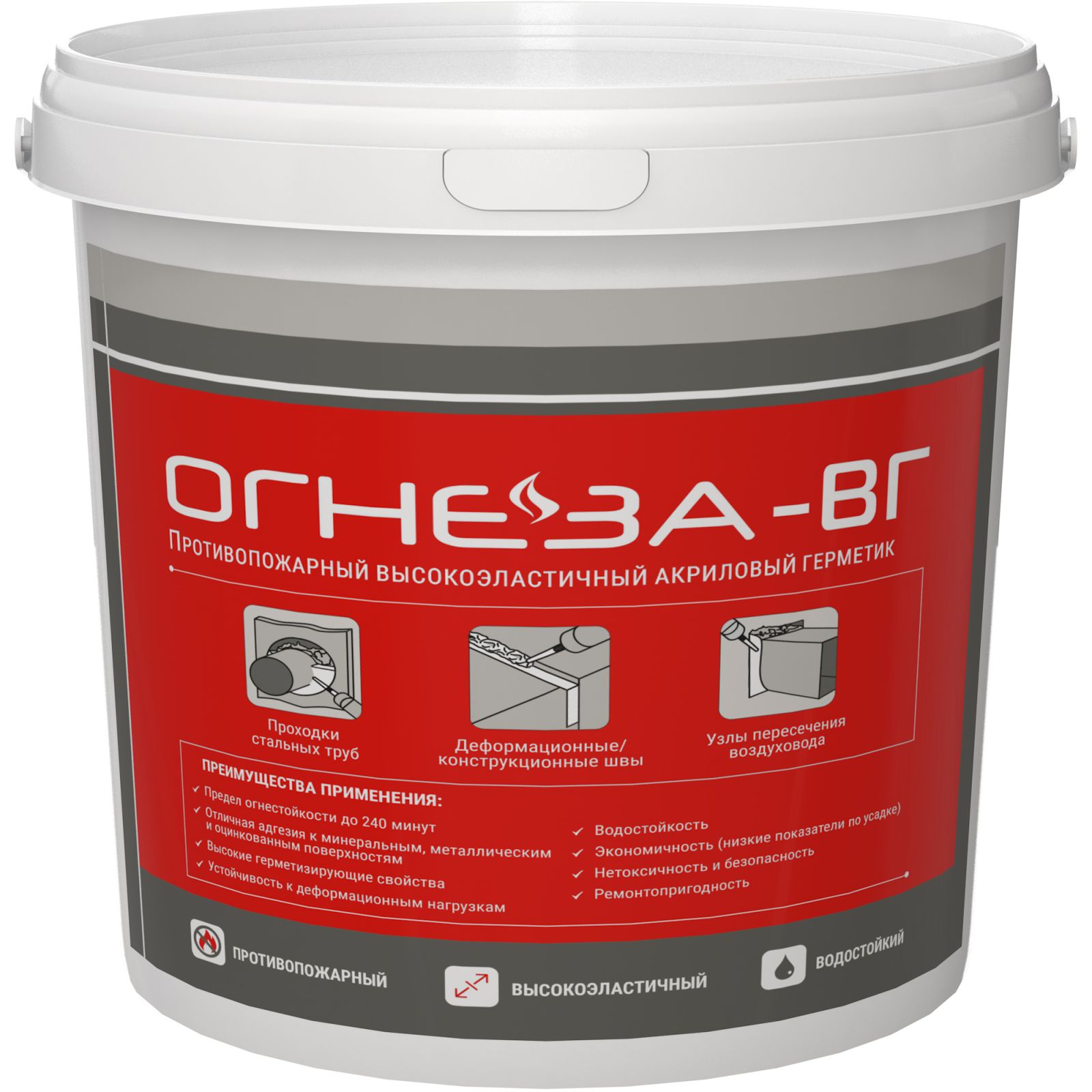 Противопожарный высокоэластичный водостойкий герметик «ОГНЕЗА-ВГ» на акриловой основе предназначен для заделки деформационных швов, универсальных проходок стальных труб и вентиляционных проходок. При воздействии огня высокоэластичный акриловый герметик уплотняется и обеспечивает высокий уровень огнестойкости – до 240 минут.