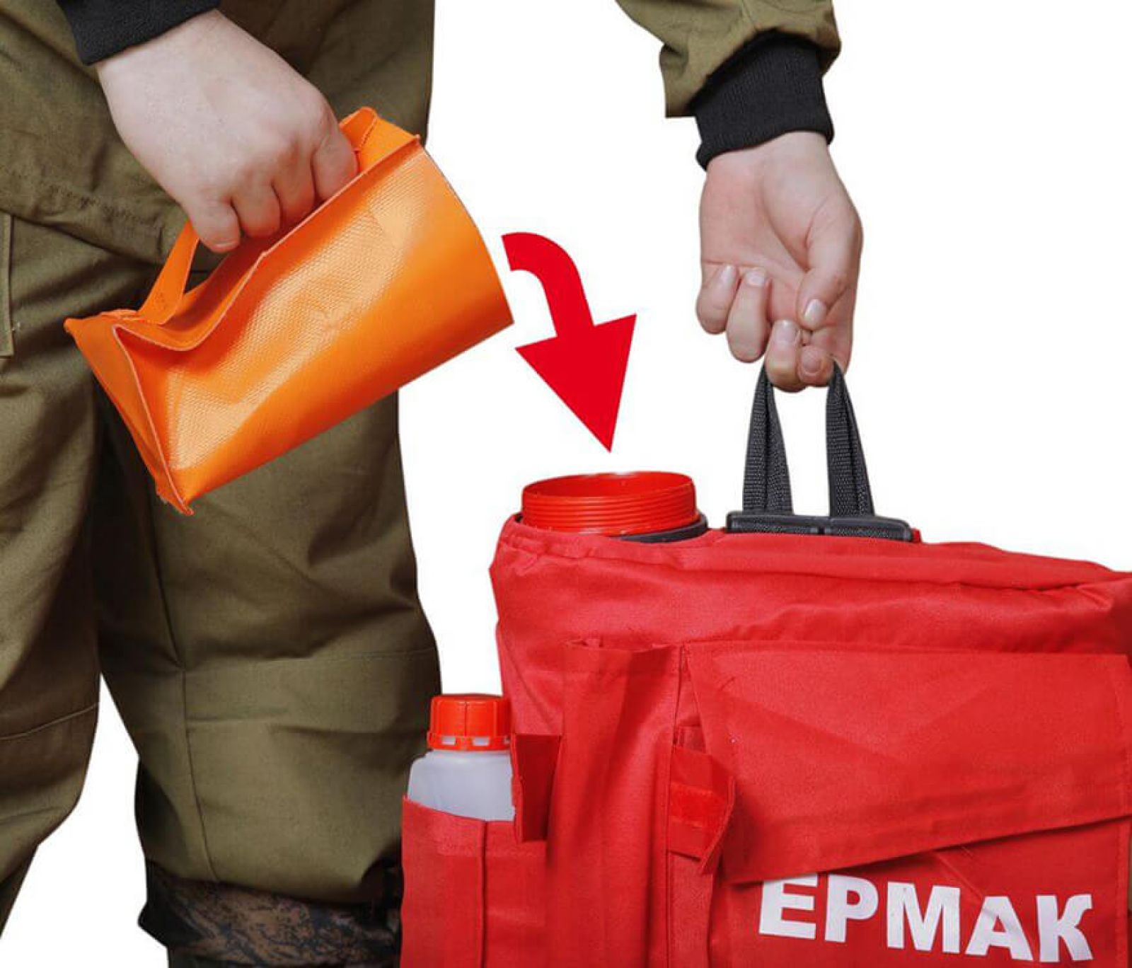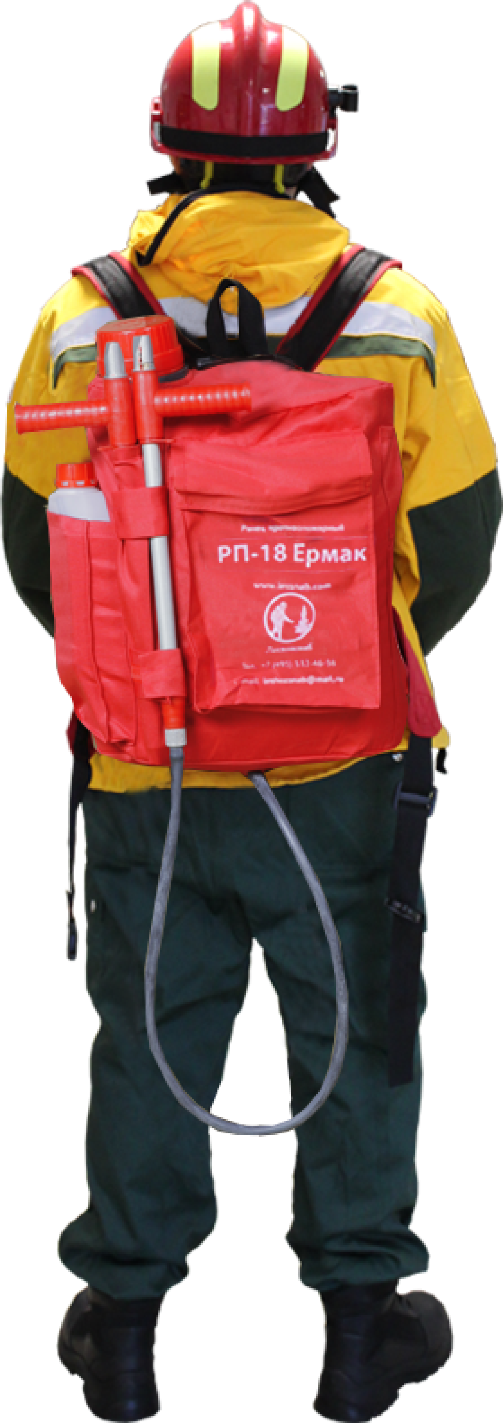 Ранец противопожарный РП-18 Ермак имеет компактные размеры и выполнен в виде заплечного ранца рюкзачного типа с горловиной с крышкой в верхней части резервуара и штуцером в донной части с присоединённым шлангом, подающим огнетушащий состав в гидропульт.