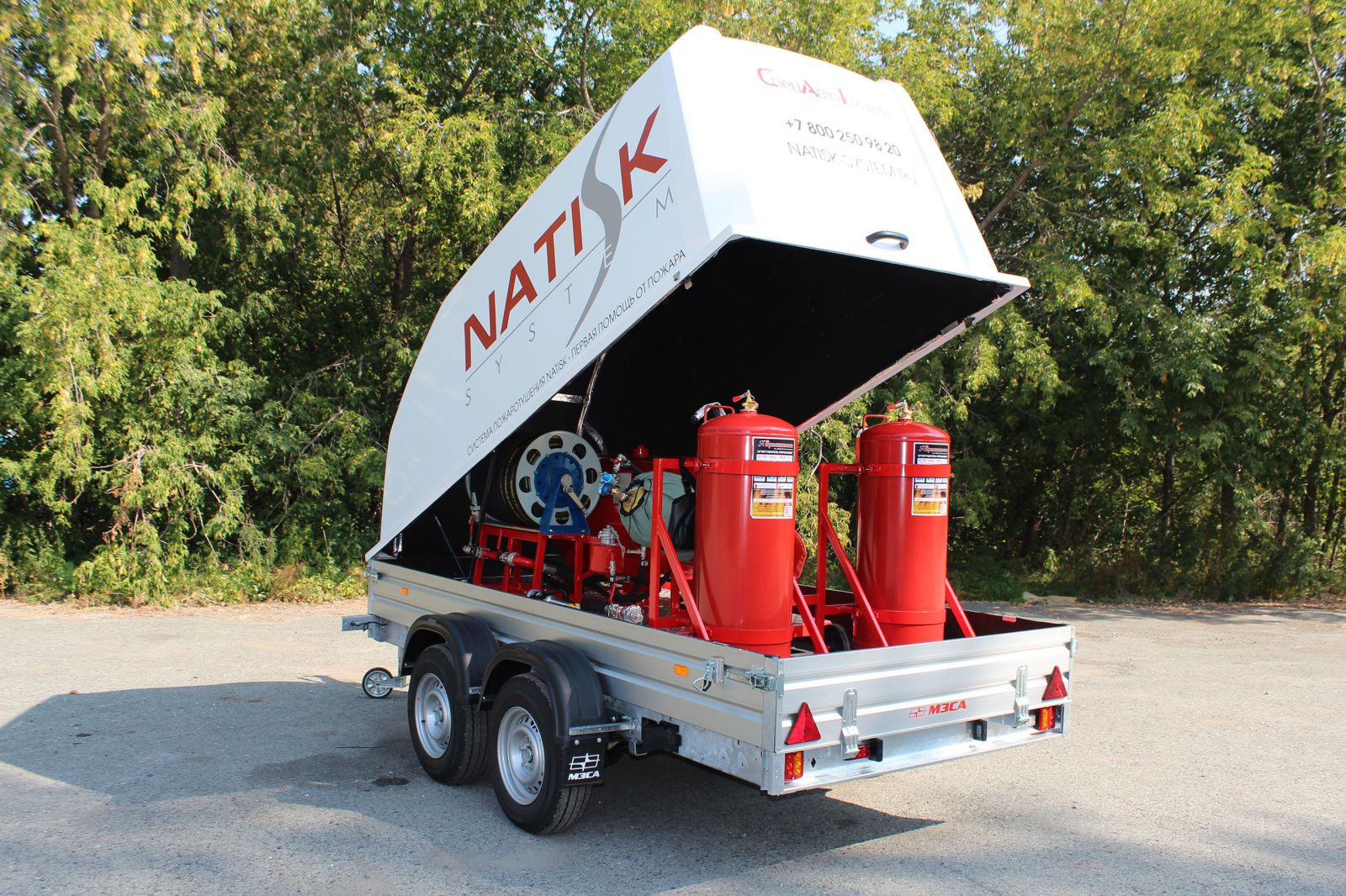 Установка пожаротушения NATISK-300BL — мобильное огнетушащее устройство массой 650 кг, монтируемое на раму, прицеп, либо в автомобиль, дальность подачи до 23 метров, объём производимой пены до 6000 литров (сравним по ресурсу с пожарной автоцистерной тяжелого класса).