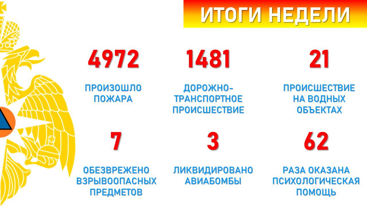 По оперативной информации также силы МЧС России выезжали на 1481 дорожно-транспортное происшествие, 21 ЧП на водных объектах. Их привлекали к обезвреживанию 7 взрывоопасных предметов, в том числе 3 авиабомб. 62 раза специалисты оказывали психологическую помощь населению.