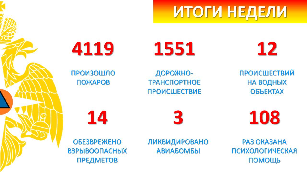 По оперативной информации также силы МЧС России выезжали на 1551 дорожно-транспортное происшествие, 12 ЧП на водных объектах. Их привлекали к обезвреживанию 14 взрывоопасных предметов, в том числе 3 авиабомб. 108 раз специалисты оказывали психологическую помощь населению.