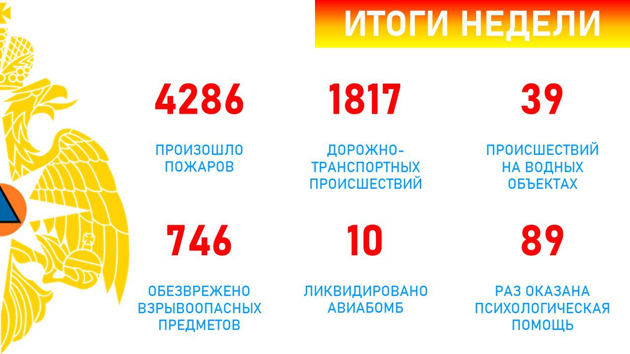 По оперативной информации также силы МЧС России выезжали на 1817 дорожно-транспортных происшествий, 39 ЧП на водных объектах. Их привлекали к обезвреживанию 746 взрывоопасных предметов, в том числе 10 авиабомб. 89 раз специалисты оказывали психологическую помощь населению.