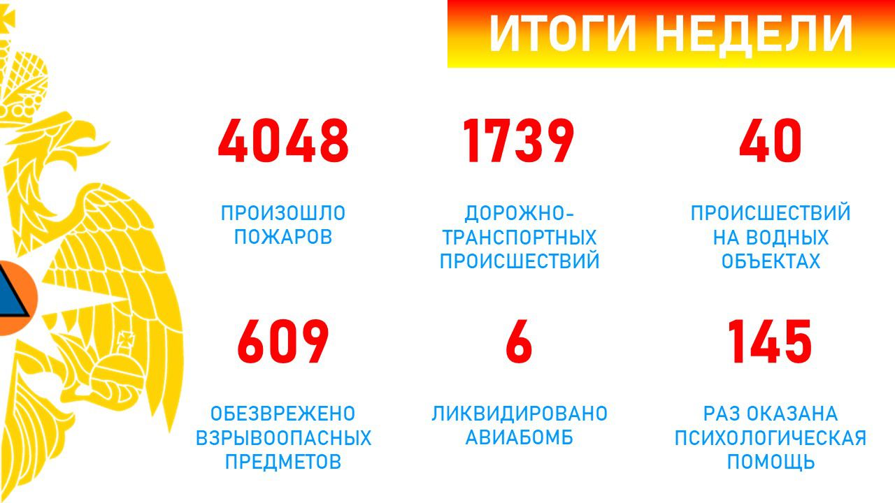 По оперативной информации также силы МЧС России выезжали на 1739 дорожно-транспортных происшествий, 40 ЧП на водных объектах. Их привлекали к обезвреживанию 609 взрывоопасных предметов, в том числе 6 авиабомб. 145 раз специалисты оказывали психологическую помощь населению.