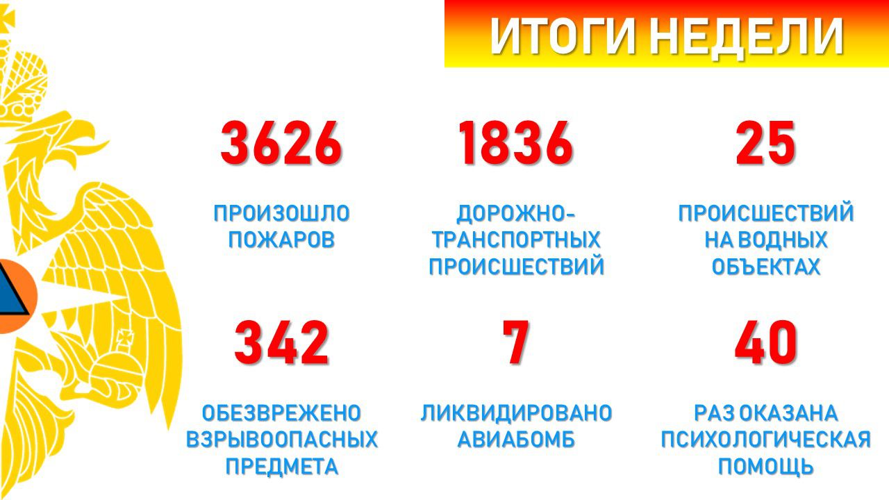 По оперативной информации также силы МЧС России выезжали на 1836 дорожно-транспортных происшествий, 25 ЧП на водных объектах. Их привлекали к обезвреживанию 342 взрывоопасных предметов, в том числе 7 авиабомб. 40 раз специалисты оказывали психологическую помощь населению.