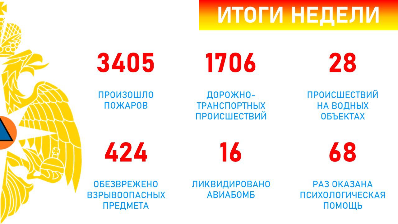 По оперативной информации также силы МЧС России выезжали на 1706 дорожно-транспортных происшествий, 28 ЧП на водных объектах. Их привлекали к обезвреживанию 424 взрывоопасных предметов, в том числе 16 авиабомб. 68 раз специалисты оказывали психологическую помощь населению.