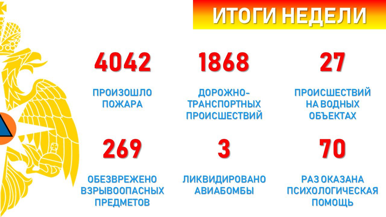 По оперативной информации также силы МЧС России выезжали на 1868 дорожно-транспортных происшествий, 27 ЧП на водных объектах. Их привлекали к обезвреживанию 269 взрывоопасных предметов, в том числе 3 авиабомб. 70 раз специалисты оказывали психологическую помощь населению.