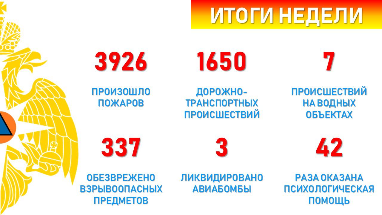 По оперативной информации также силы МЧС России выезжали на 1650 дорожно-транспортных происшествий, 7 ЧП на водных объектах. Их привлекали к обезвреживанию 337 взрывоопасных предметов, в том числе 3 авиабомб. 42 раза специалисты оказывали психологическую помощь населению.