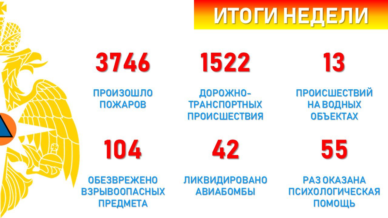 По оперативной информации также силы МЧС России выезжали на 1522 дорожно-транспортных происшествия, 13 ЧП на водных объектах. Их привлекали к обезвреживанию 104 взрывоопасных предметов, в том числе 42 авиабомб. 55 раз специалисты оказывали психологическую помощь населению.