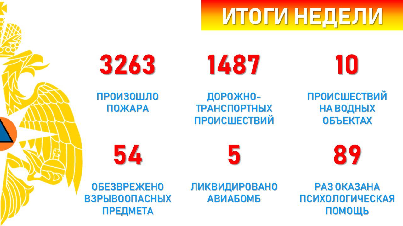 По оперативной информации также силы МЧС России выезжали на 1487 дорожно-транспортных происшествий, 10 ЧП на водных объектах. Их привлекали к обезвреживанию 54 взрывоопасных предметов, в том числе 5 авиабомб. 89 раз специалисты оказывали психологическую помощь населению.