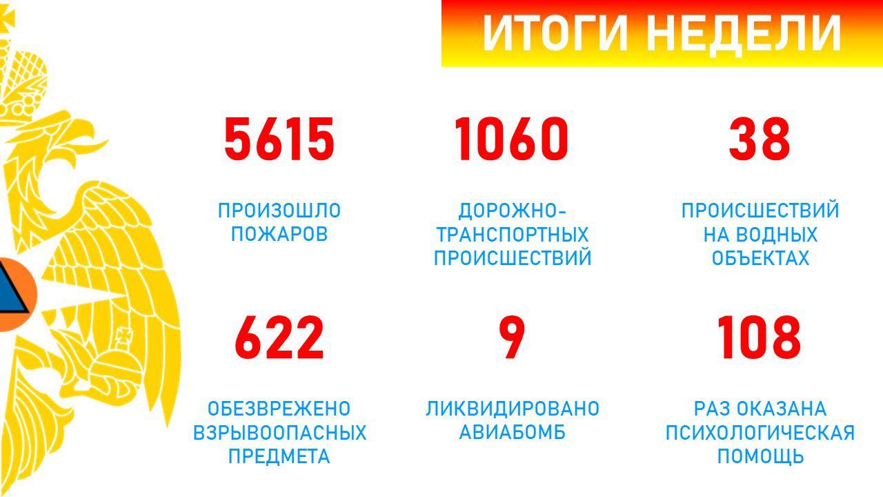 По оперативной информации также силы МЧС России выезжали на 1060 дорожно-транспортных происшествий, 38 ЧП на водных объектах. Их привлекали к обезвреживанию 622 взрывоопасных предметов, в том числе 9 авиабомб. 108 раза специалисты оказывали психологическую помощь населению.