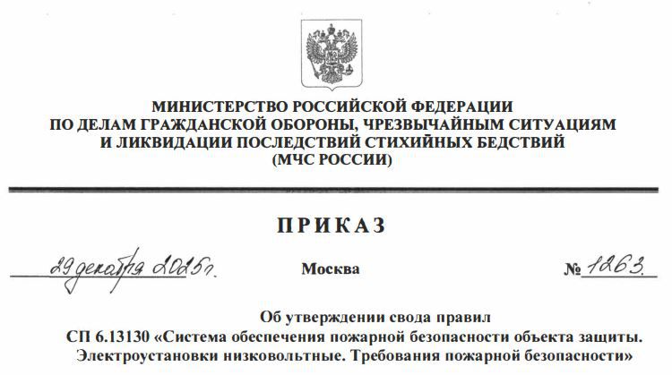 СП 6.13130 «Система обеспечения пожарной безопасности объекта защиты. Электроустановки низковольтные. Требования пожарной безопасности».