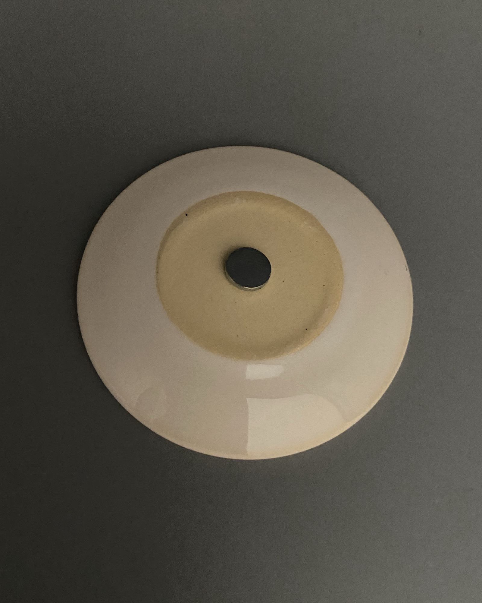 Магнит изготовлен из белой глины и имеет диаметр 7,5 см., что делает его компактным и удобным для размещения на холодильнике или любой другой металлической поверхности. Он выполнен в технике деколькомания, что придает ему яркость и насыщенность.