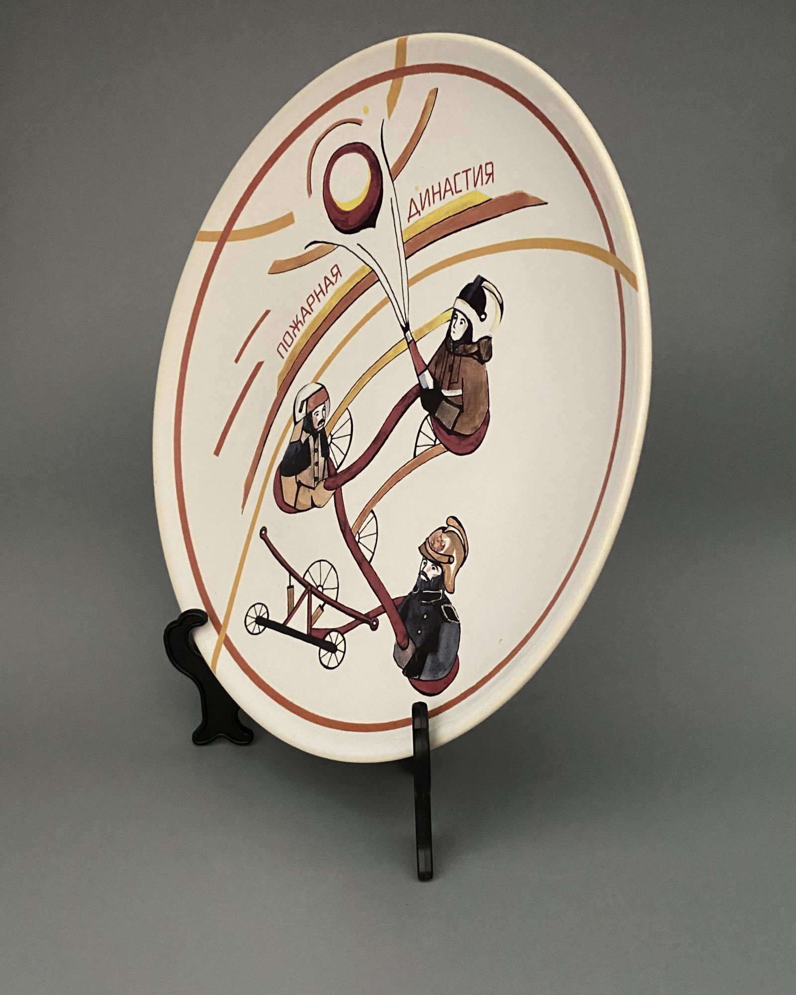 Дизайнерская, тематическая тарелка «Пожарная династия» (диаметр 20 см.) - это уникальный подарок, который изготовлен из белой глины, выполнен в технике деколькомания и создан для того, чтобы напоминать о незабываемых моментах жизни, связанных с профессиональной деятельностью пожарных и спасателей, учебой и работой в пожарно-технических вузах МЧС.