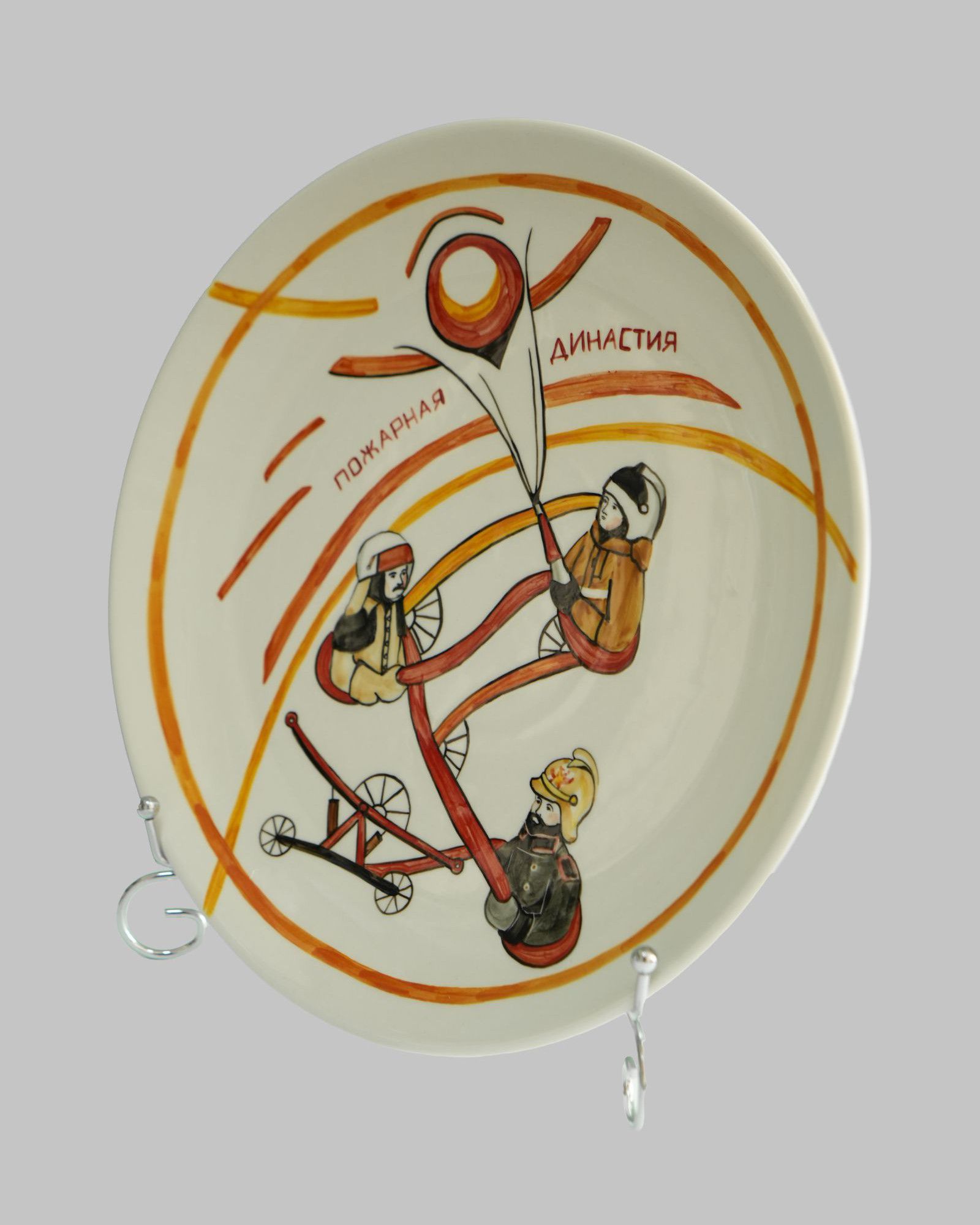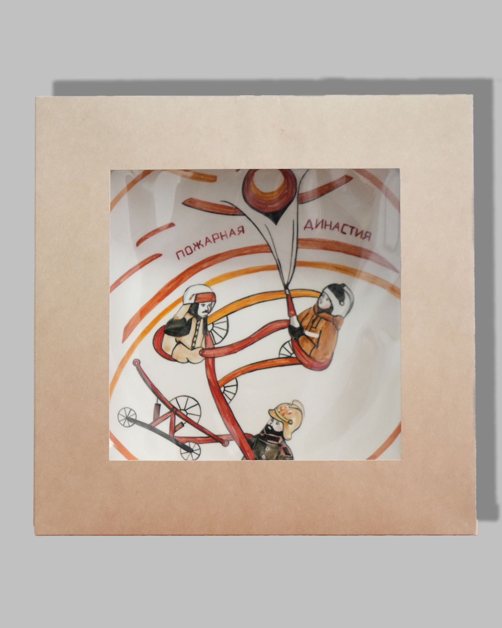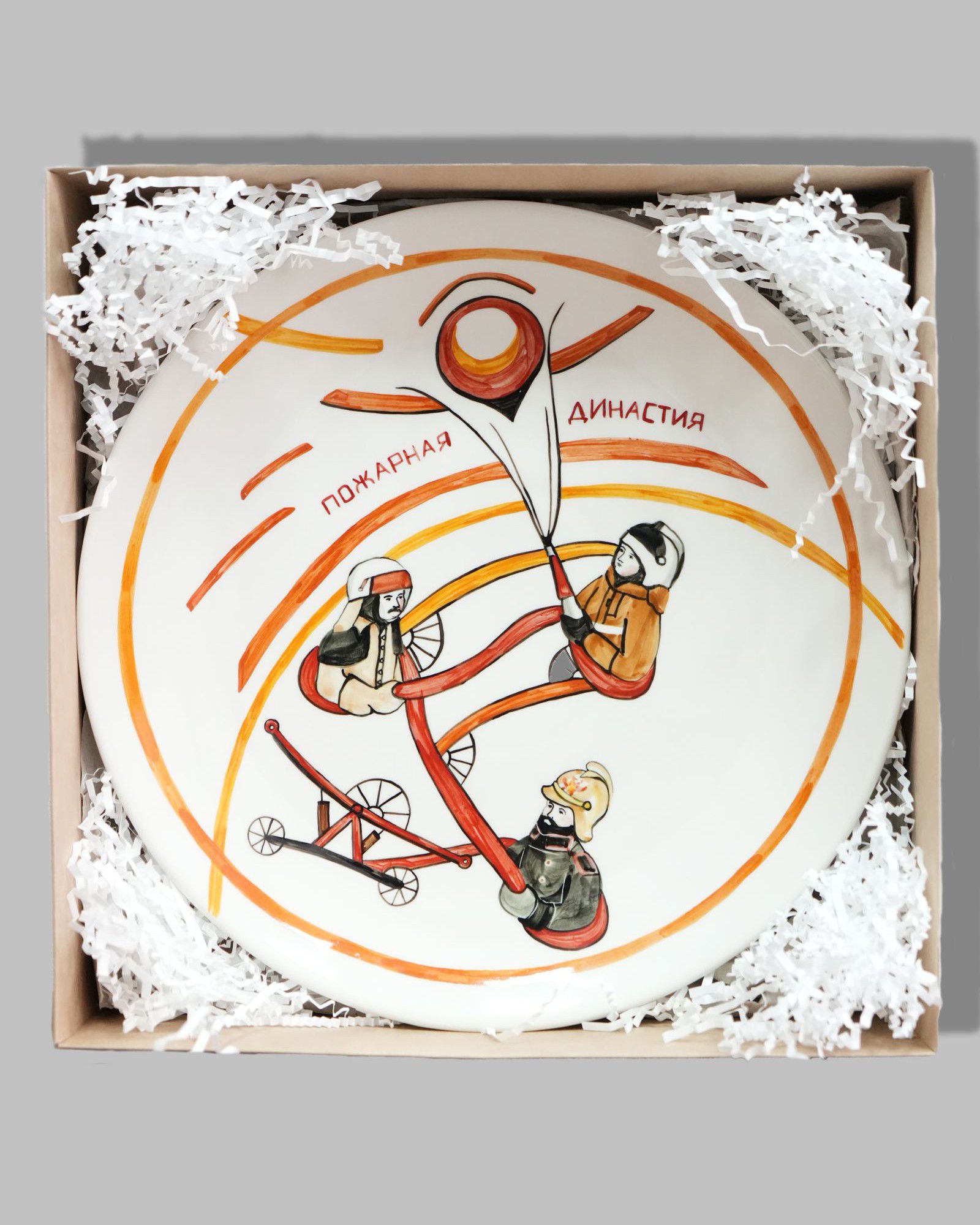 Дизайнерская, тематическая тарелка «Пожарная династия» (диаметр 30 см) представляет собой уникальный подарок, который отличается своей оригинальностью и качеством исполнения. Это авторская работа, изготовленная и расписанная вручную мастерицей фабрики с использованием фарфорового шликера, специальных форм, подглазурной росписи. Каждая деталь и элемент на тарелке проработаны с большой тщательностью и вниманием к деталям, что делает ее поистине уникальной.