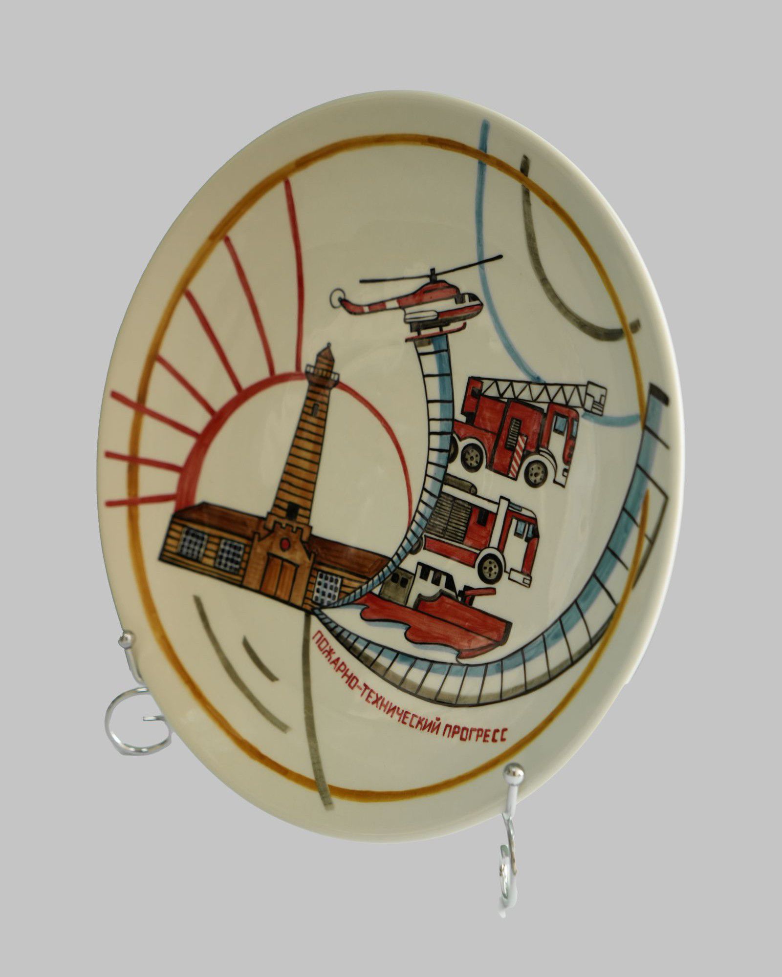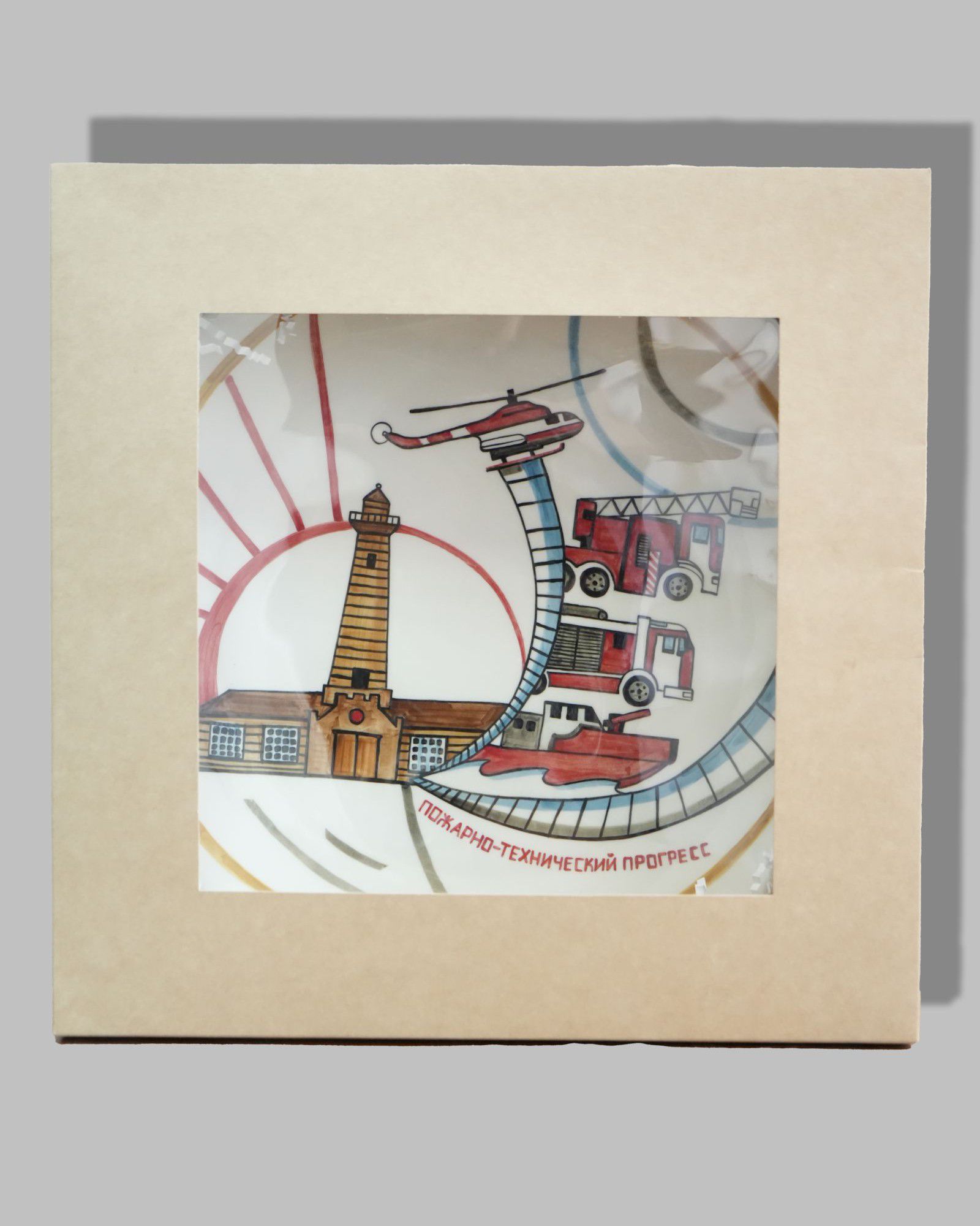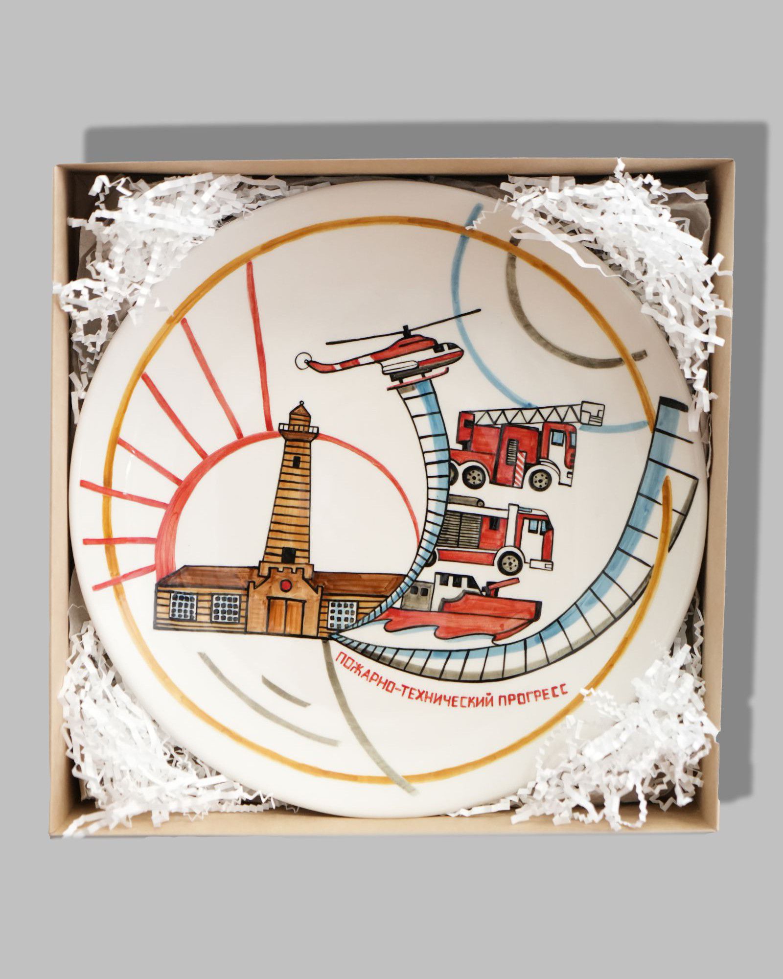 Дизайнерская, тематическая тарелка «Пожарно-технический прогресс» (диаметр 30 см) представляет собой уникальный подарок, который отличается своей оригинальностью и качеством исполнения. Это авторская работа, изготовленная и расписанная вручную мастерицей фабрики с использованием фарфорового шликера, специальных форм, подглазурной росписи. Каждая деталь и элемент на тарелке проработаны с большой тщательностью и вниманием к деталям, что делает ее поистине уникальной.
